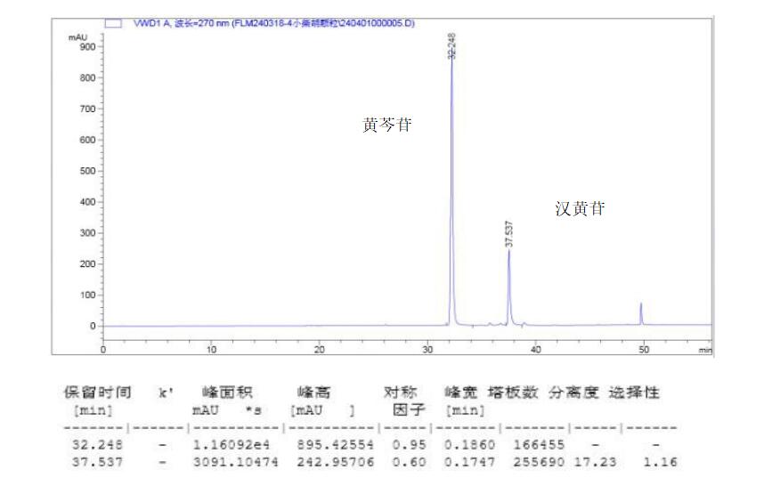 在進(jìn)行這些檢測(cè)時(shí),需要使用特定的色譜條件,如色譜柱、流動(dòng)相、流速、檢測(cè)器和柱溫等。同時(shí),還需要制備對(duì)照品溶液,以便與供試品進(jìn)行比較和定量。 App ID: FLM-F240001 小柴胡顆粒中黃芩提取物的檢測(cè) 方法:小柴胡顆粒中黃芩提取物檢查項(xiàng)補(bǔ)充檢驗(yàn)方法(BJY 202304) 色譜柱:FastCore SuperC18 2.7μ 100*4.6mm 貨號(hào):FSD-27SC18-EONU 流速:0.6 mL/min 柱溫:25℃ 檢測(cè):UV 270nm 流動(dòng)相:A:甲醇 B:0.5%甲酸 方法說(shuō)明:結(jié)果顯示,實(shí)測(cè)理論板數(shù)按黃芩苷峰計(jì)算 166455,柱效遠(yuǎn)高于的藥典要求的 5000,滿足檢測(cè)要 求。色譜柱推薦 FastCore SuperC18 2.6μ 100*4.6mm(貨號(hào):FSD-26SC18-EONU )或 FastCore SuperC18 2.7μ 100*4.6mm(貨號(hào):FSD-27SC18-EONU )。